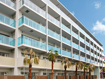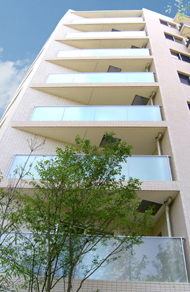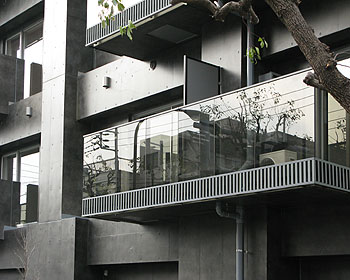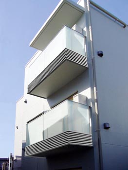 手摺ガラスの下部に立体感のあるデザインアルミパネルを取付け、躯体を隠したスタイリッシュなデザインです。 |