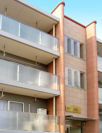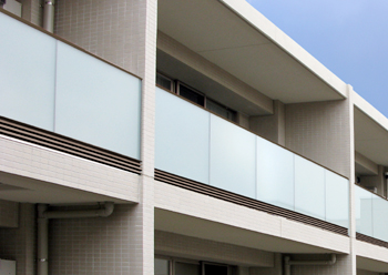 手摺の支柱を背後に隠し、ガラスパネルを前面全体に配置した美しいスタイルが 丸豊建硝独自の意匠として認められました。
